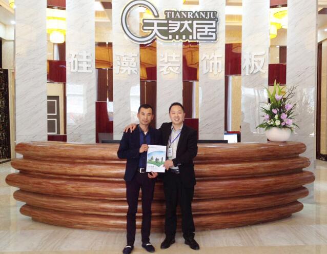 圖片信息:天然居硅藻板總部王經(jīng)理(右)與富順代理商吳先生(左)留影